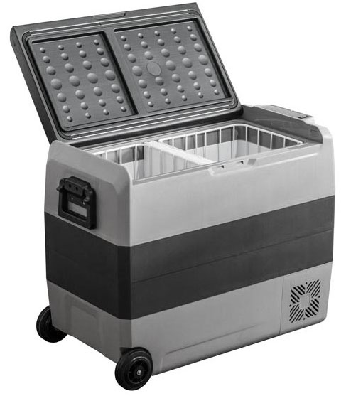 Автомобильный холодильник оснащен удобными колесами и выдвижной ручкой для удобства транспортировки вне автомобиля.
